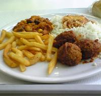 お昼は学会会場の大学のカフェテリア。イタリア式にパスタ→メイン→付け合せの野菜の順でのせてもらいます。パスタのコーナーにご飯らしきものがあったので、頼むと上から粉チーズとトマトソース。うーん、その食べ方はどうかなあ。味は実際問題として普通に味のしないリゾットに缶のパルメザンチーズと薄いトマトソースをかければ再現できます。あとはミートボールと豆とポテト。レストランで食べるのもおいしいけど、ちょっと気軽に選んで食べるのも楽しいものです。どの国でも大学のカフェテリアってまあそうおいしいものではないと思うのだけれど、このイタリア式昼ごはんはなかなかよかったです。